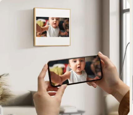 een vierkante lijst aan de muur, waarop u foto’s uit een album kunt bekijken of zelfs rechtstreeks van uw telefoon kunt streamen. Van enkele lijst tot onopvallend object tussen meerdere schilderijen. Zie de prachtige foto impressie hieronder.